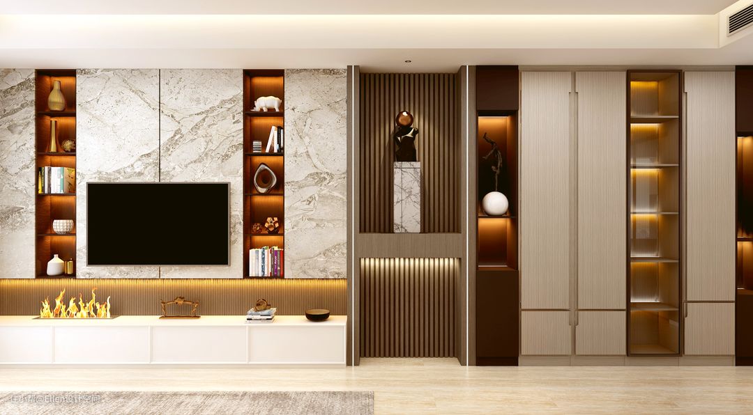 电视背景墙和储物柜收纳功能强大,门板为隐形把手,用高柜专用闭门器开合更加方便。浅灰色柜体搭配黑色开放格,储物柜中间做造型背景墙装饰,让空间大气简约、时尚摩登。