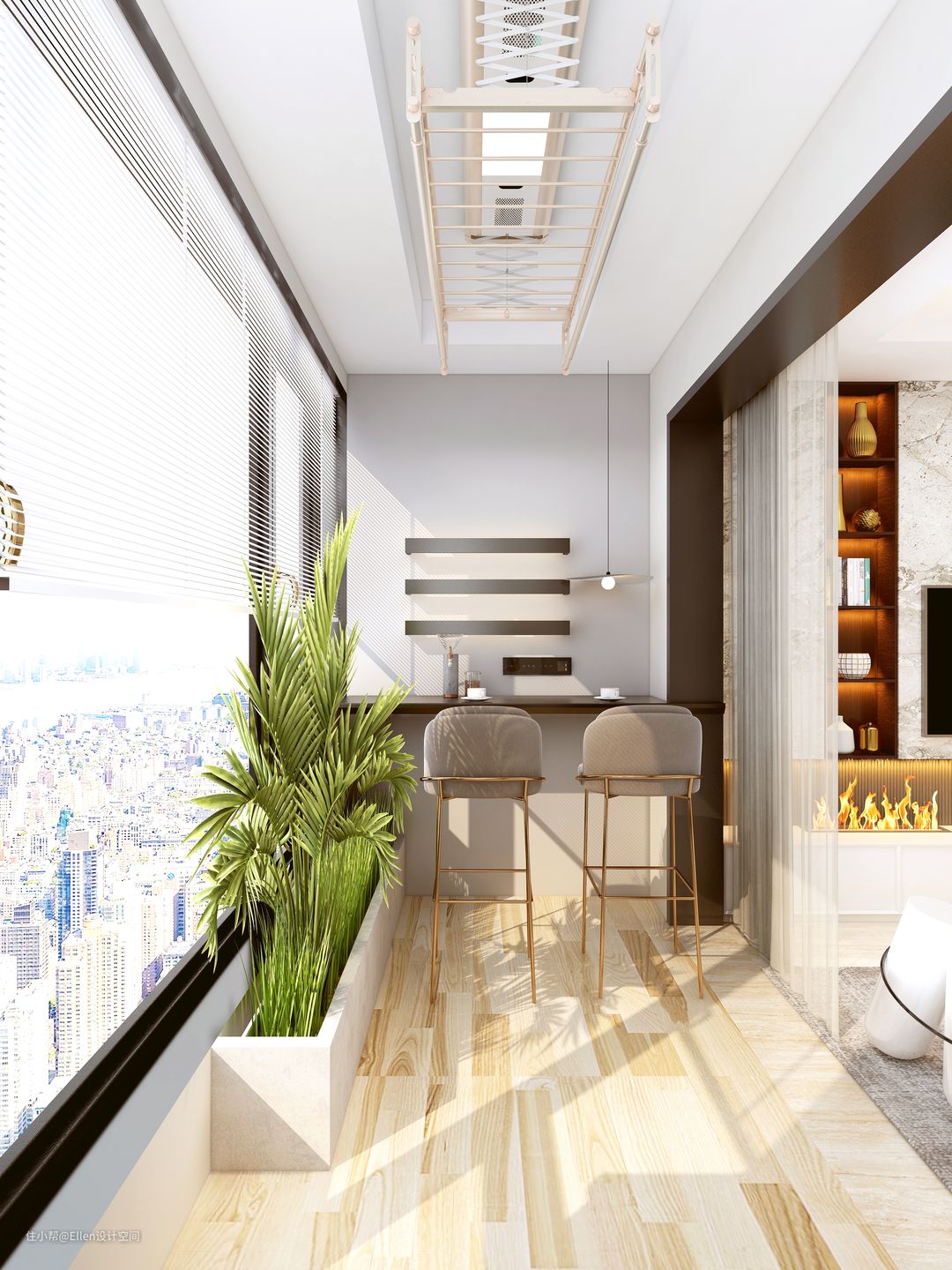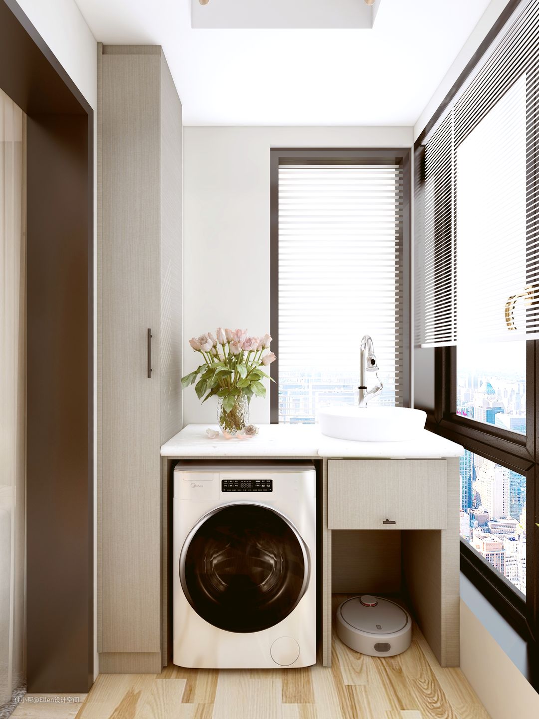 阳台作为休闲生活阳台,定制洗衣区,内嵌洗衣机,不挡住享受窗外的美景,不挡住对着夜色点开吊灯,柔光照射里,微醺一杯的心情。