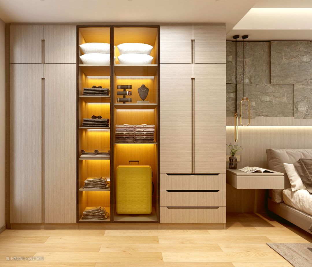 根据生活作息动线,将衣帽间和卫生间连在同一条动线上,不会影响光线,动线自然,这样洗完澡出来换衣服会更加方便,合理,同时主卧衣帽间要注意防潮施工。
