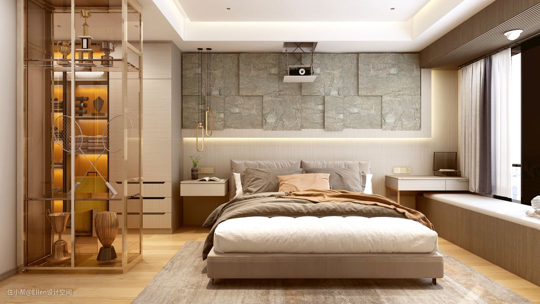 主卧的设计讲随性前卫的个性延伸至主卧,梳妆台巧妙搭接在飘窗处,沐浴着阳光的同时,和自家猫咪一起享受着精致的护肤梳妆生活。储物功能强大的主卧衣帽间设计,材质和灯光的搭配,不仅色彩上呼应了整个主题色,低调的奢华感尽收眼底。