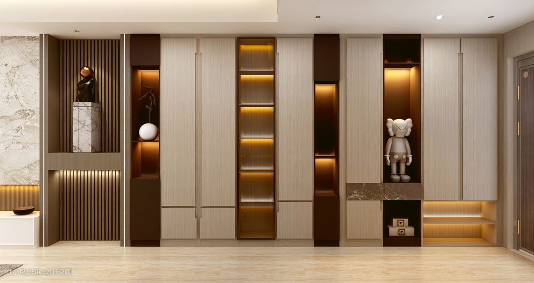 跟入户玄关鞋柜相结合,设计一排储物功能强大的储物柜兼具酒柜,与旁边的装饰造型相结合,美观灵动。