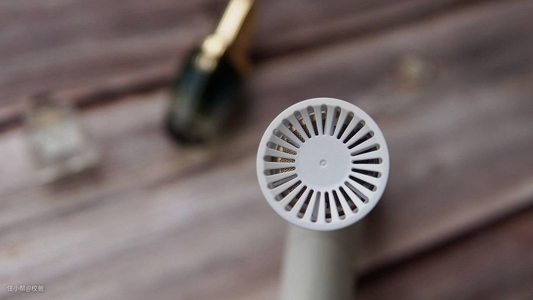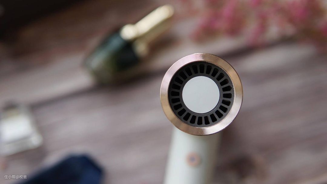 这就是小T吹风机的出风口了,金色的外圈,显得高贵大方,内置负离子发生器,2000万级负离子,迅速中和静电,出风口陶瓷片经过热风加热后,释放的远红外线通过与湿发中的水分子共振,加快蒸发、速干。这样随风吹出来的负离子就能更好地作用到头发上了,使得秀发柔顺易梳,不再毛躁。