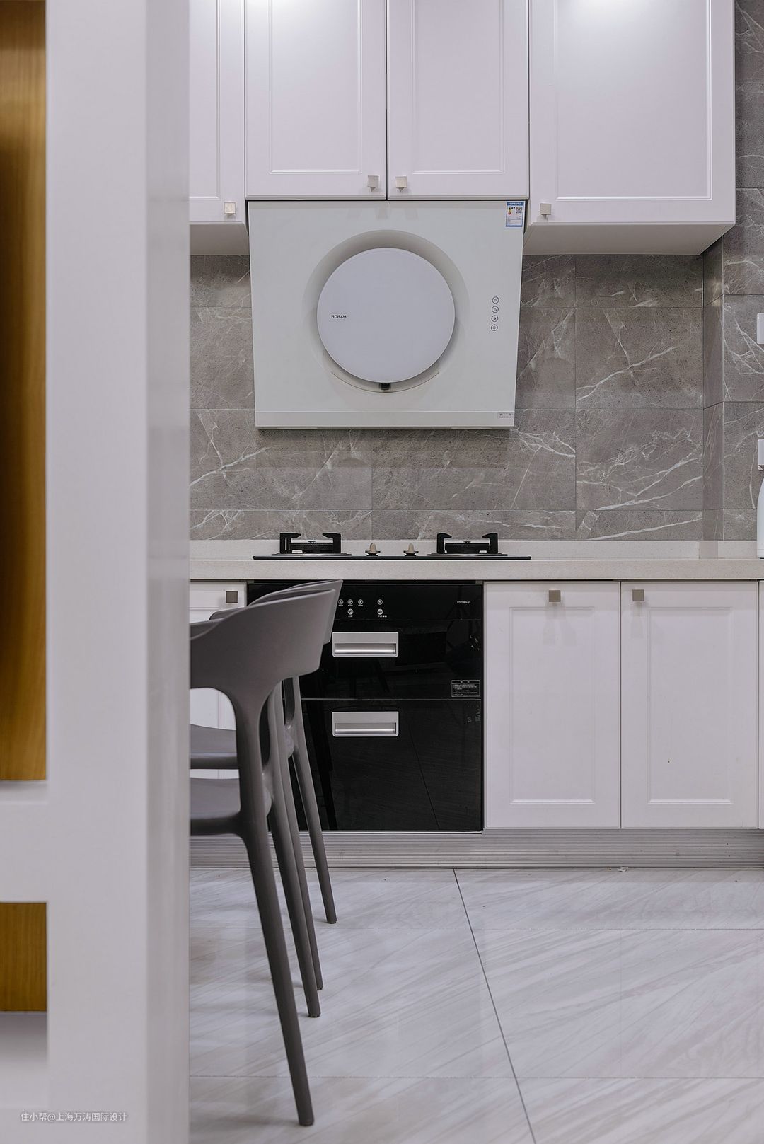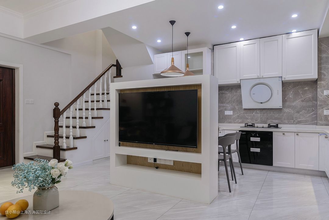 楼梯下方空间设计了一整排储物柜子,增加收纳;橱柜也一起连过来靠墙做了通透玻璃高柜,方便后期放置杯子红酒之类物品。