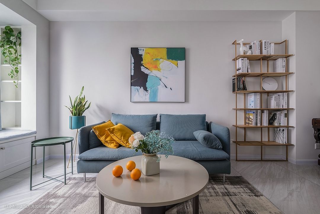 简洁为主,素雅的色彩搭配,挂画上的一抹黄点亮空间。蓝色沙发上用两只亮黄色抱枕呼应。
