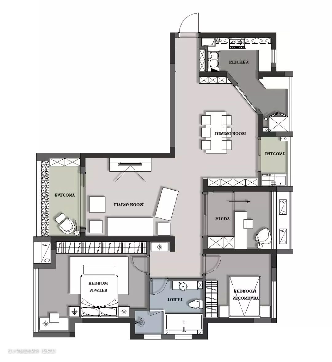 4、主卫变成公卫,储物间变成公卫的一部分,离两个卧室非常近。