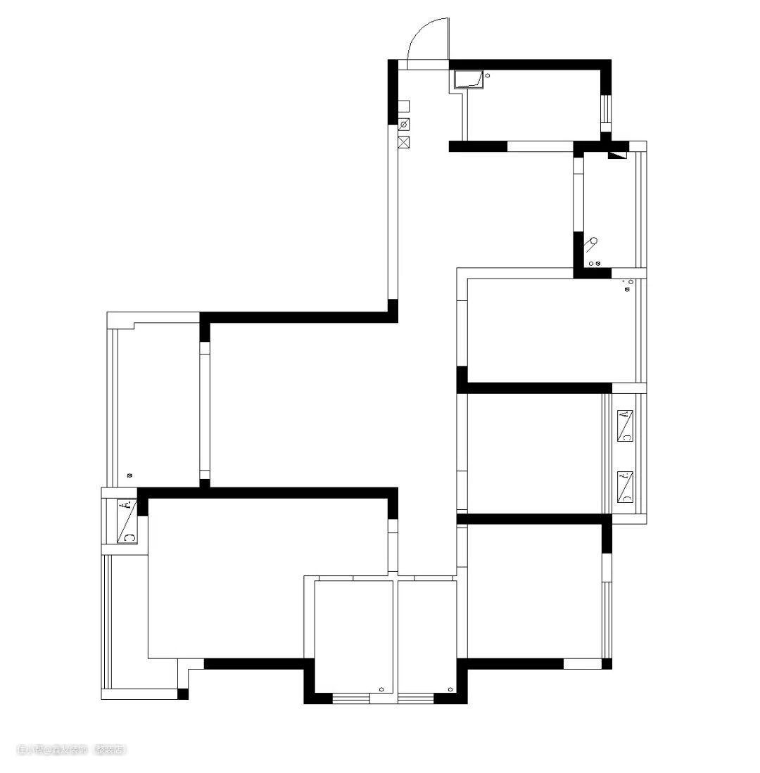 入户右边就是厨房,厨房过来是卫生间。把厨房卫生间单拎出来,都显得两个空间实在过于狭小。卫生间隔壁的两个小房间中间有一堵承重墙,单拎出来做卧室都不合适,太小。而且都做卧室的话就会让餐厅显得也局促。走廊狭长,太过深邃且不方便装饰。