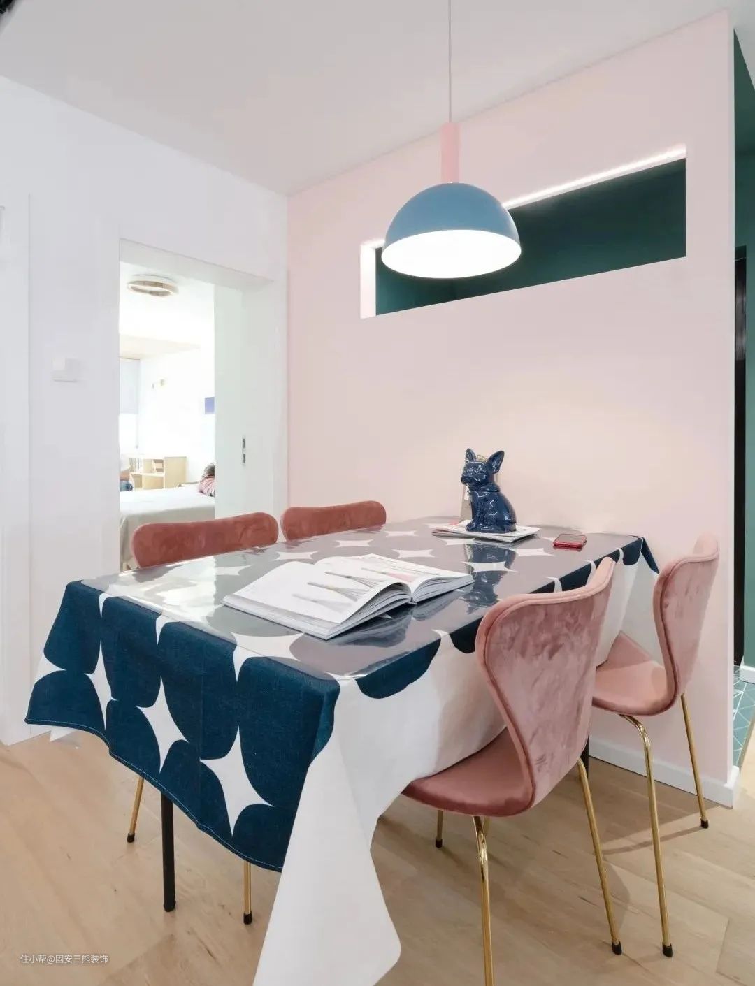 餐厅就在玄关的墙面后方,这面墙以淡粉色进行区分,与粉色的餐椅、蓝粉配的吊灯相呼应,为住客呈现出一种浪漫优雅的用餐体验。