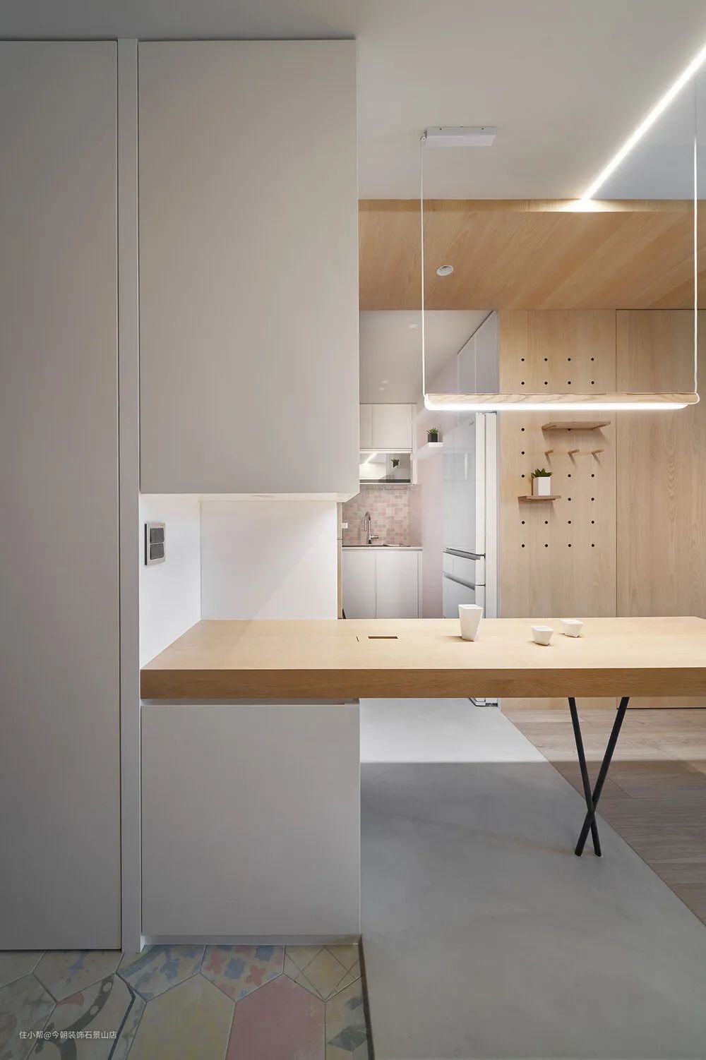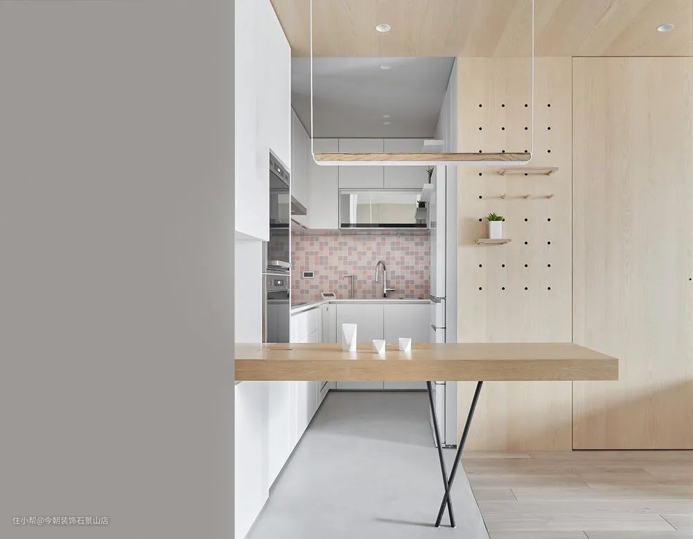 厨房部分,地坪使用矿物涂料与电视墙面整合,左侧餐桌则为厨房延伸。而因为女主人喜欢有点粉色元素,所以我们选择比较可爱的马赛克砖贴在厨房中段,让空间比较活泼一点。