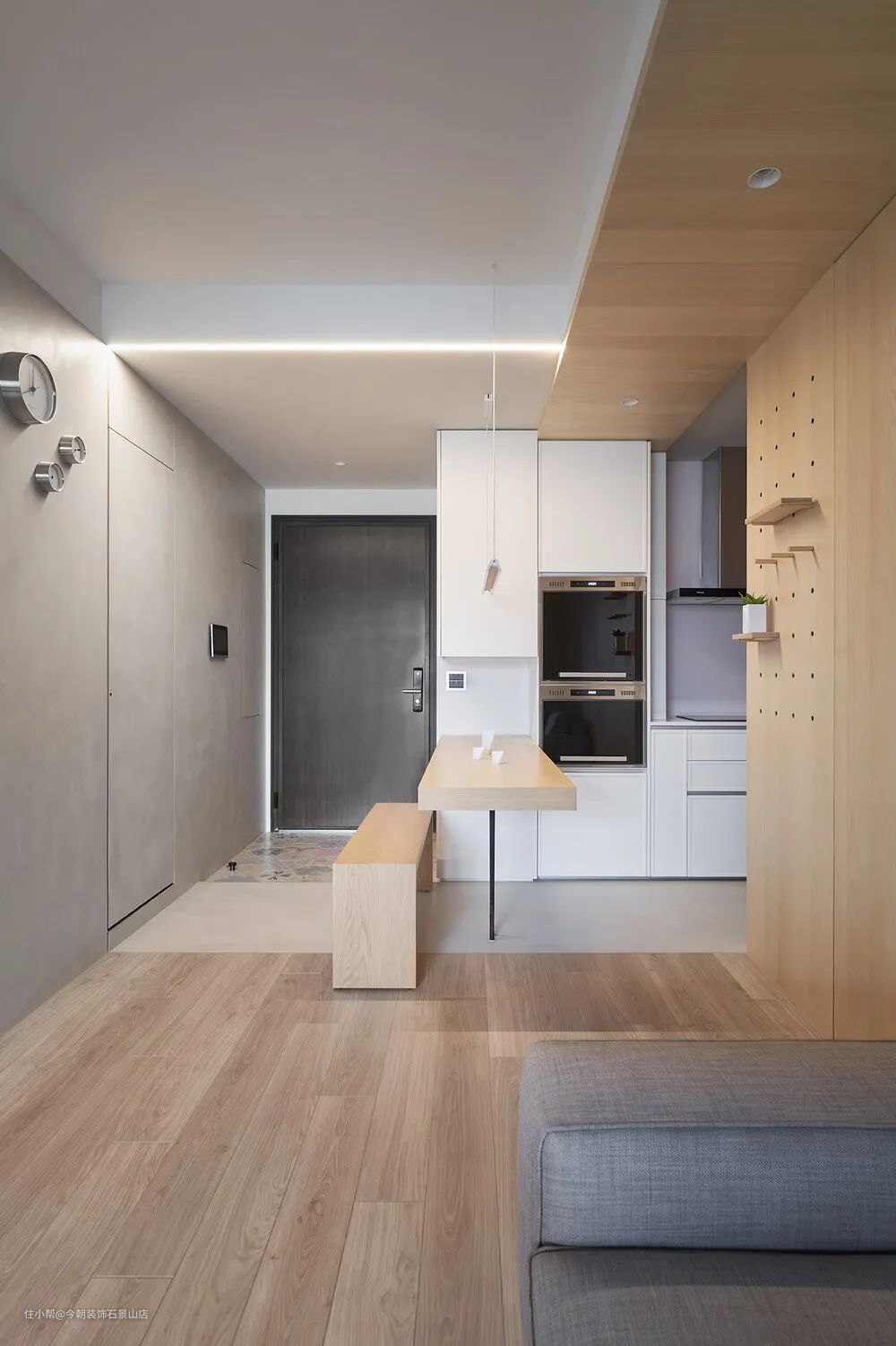 因为空间小,所以尽量将柜子整合再一起,储藏室+鞋柜+餐桌+电器柜+厨具柜,麻雀虽小五脏俱全。
