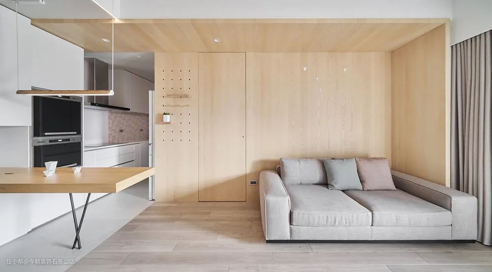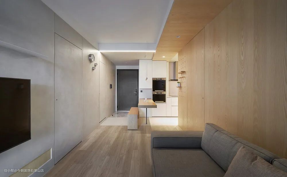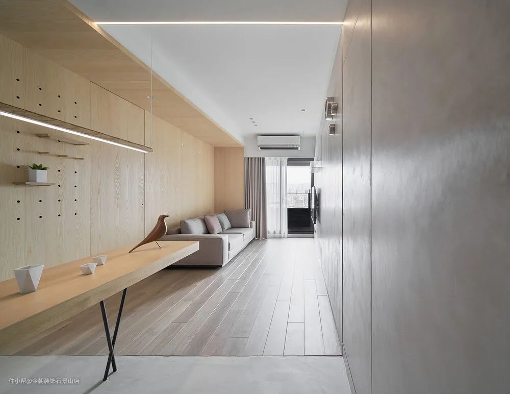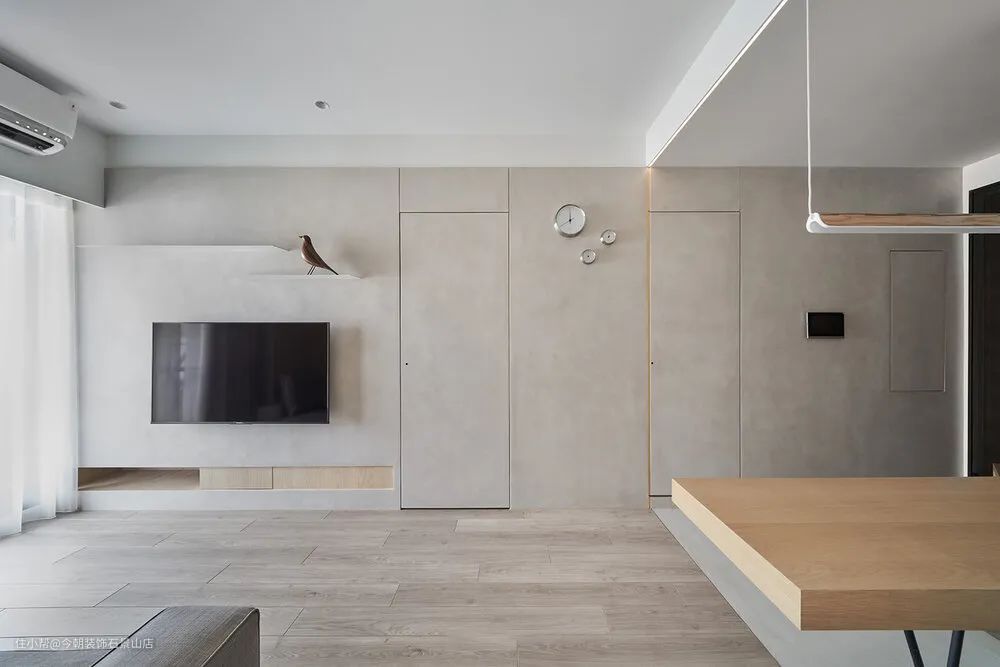 客厅沙发背墙用一个木皮色块将柱子跟上方大梁整合,后方为主卧;电视墙面主要简单干净为主,木质框出沙发空间,客厅回归到最简洁状态,收纳柜子都隐藏起来,留给小孩一个干净的游戏空间。