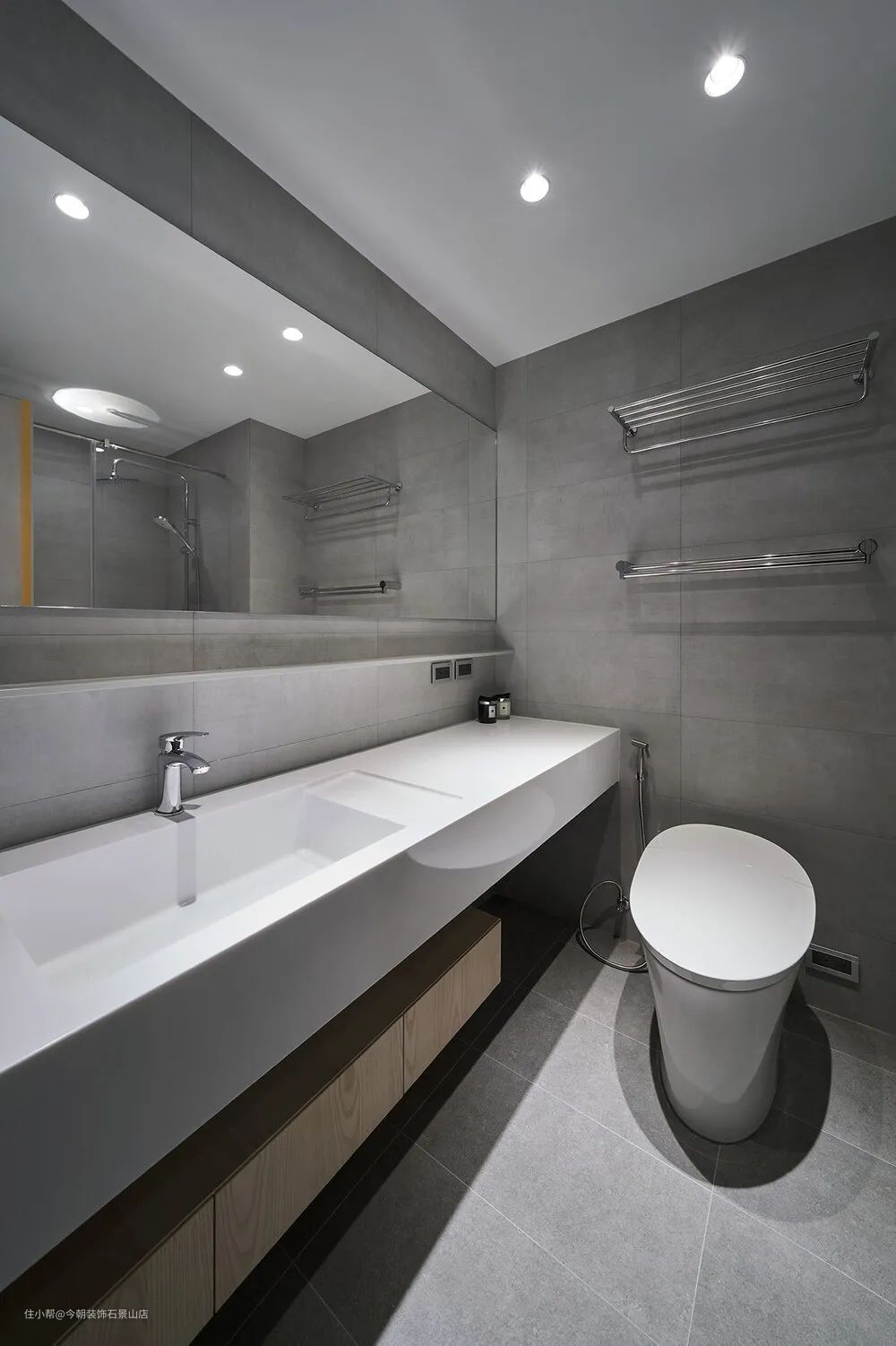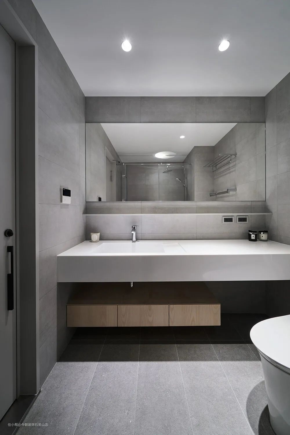 浴室因为只有一间,所以就希望能够大一点,整间浴室走灰色调没有太多复杂的设计,尤其是这一个超大的洗手台面,用铁件做框架底,外头包覆人造石一体成形,易打理不易变色。