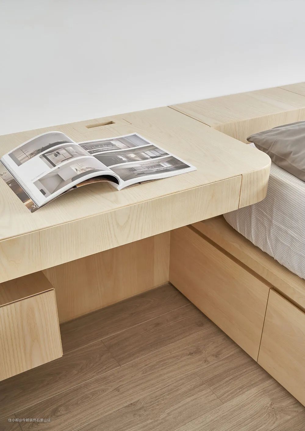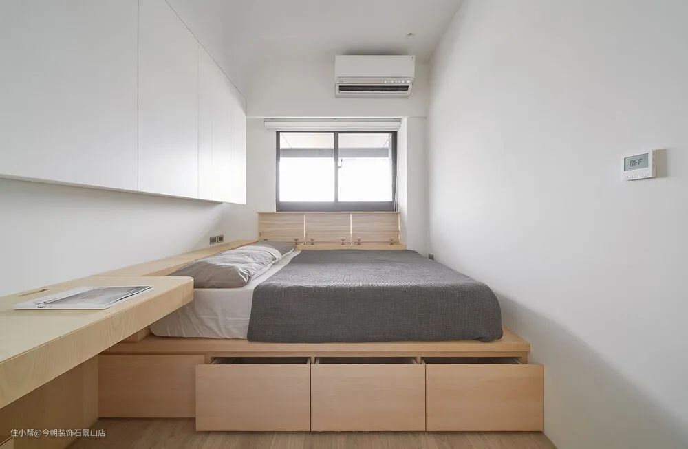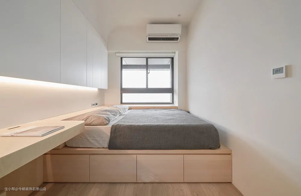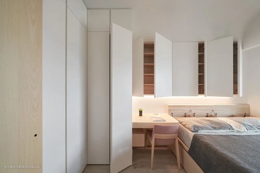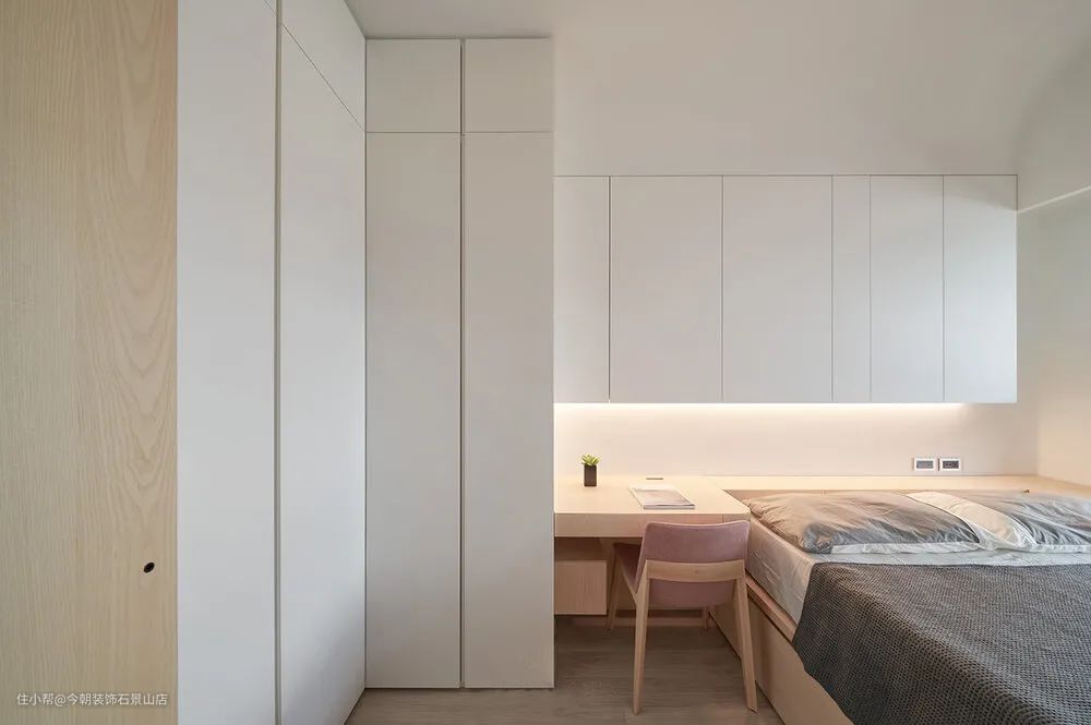 主卧室因为空间不大,所以将衣柜设计成L型并且与化妆桌整合,床头上方也做了不少收纳柜。也因空间关系所以床架设计成卧榻形式,下方可以做成收纳,上方就直接摆放床垫就好;化妆桌转角圆弧收边,对于小孩比较安全。