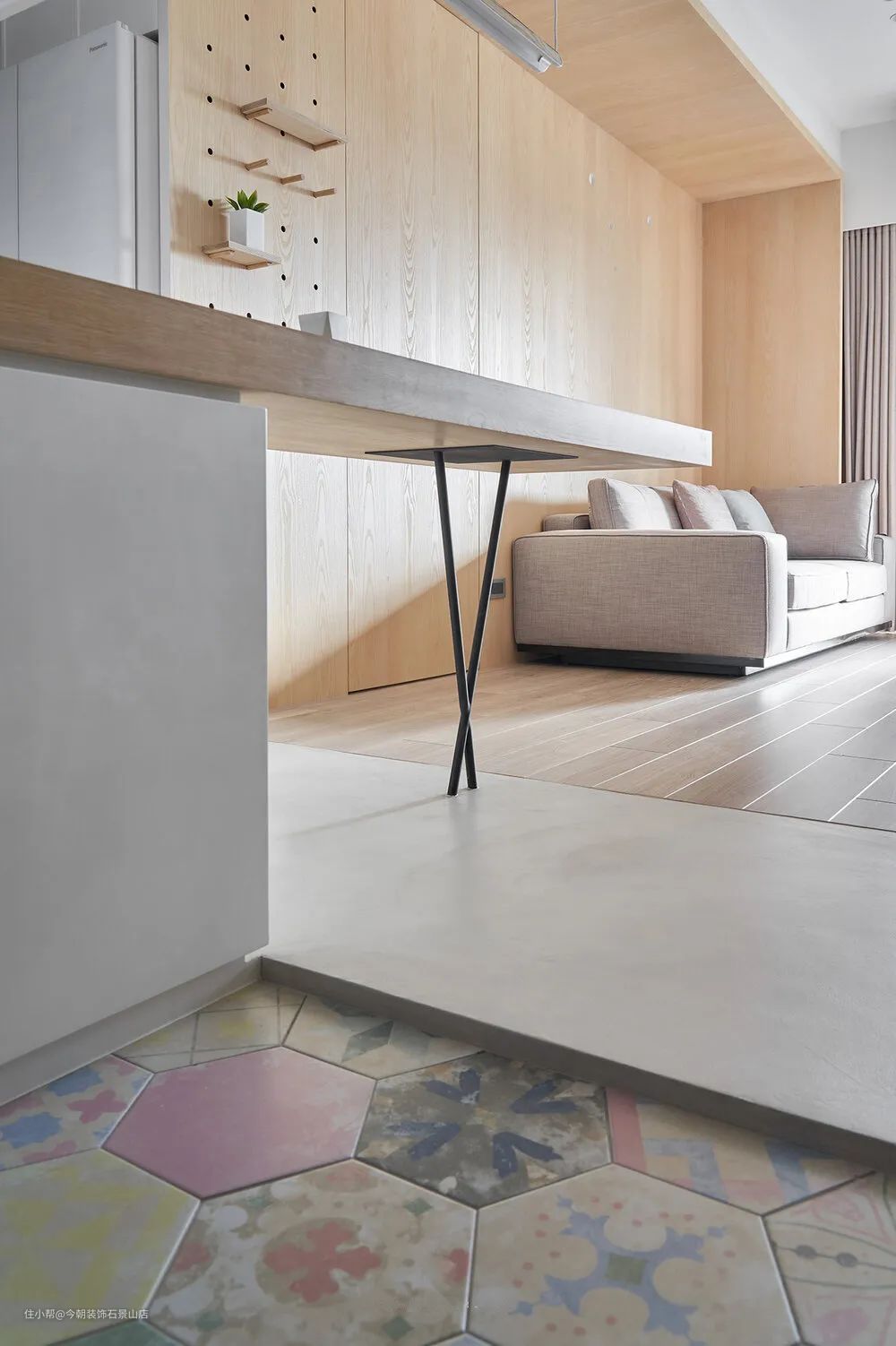落尘区与室内有两公分高低差,因为屋主喜欢花砖所以就挑选比较活泼的六角砖为主。厨房地坪使用矿物涂料与电视墙面整合,左侧餐桌则为厨房延伸。