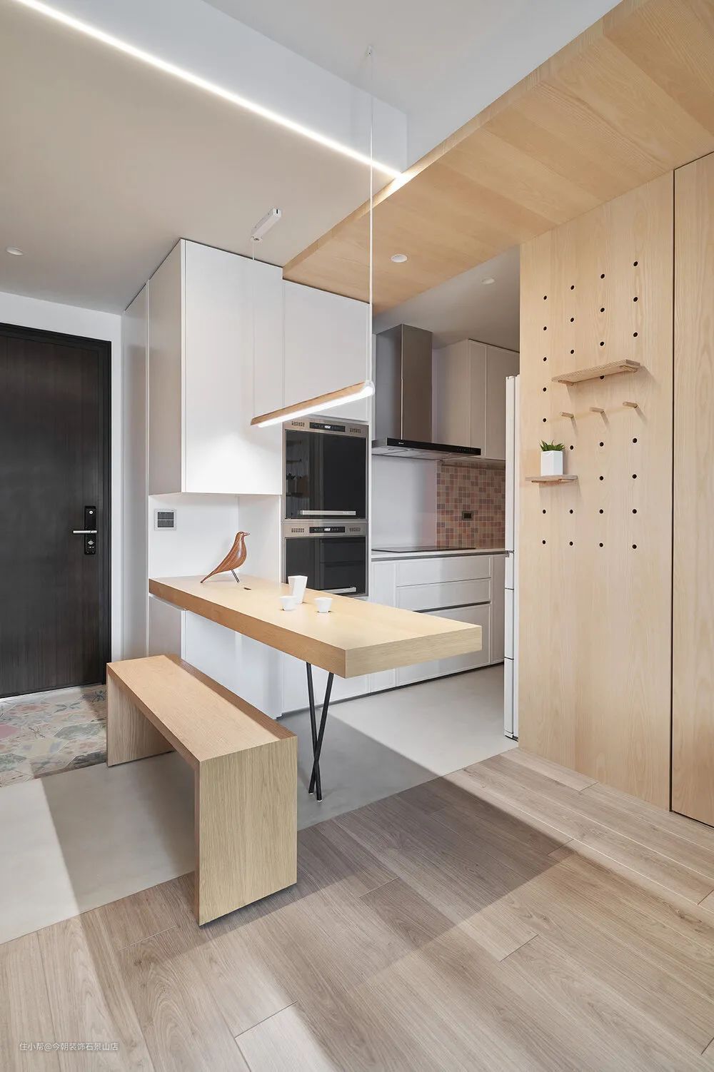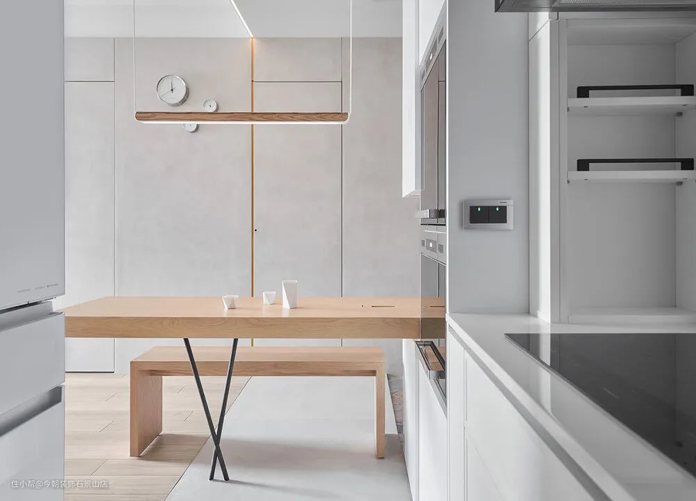让餐桌延伸到鞋柜,也可以变成回家暂时放包包或东西的平台;餐桌旁边的凳子,也变成换鞋椅的功能。