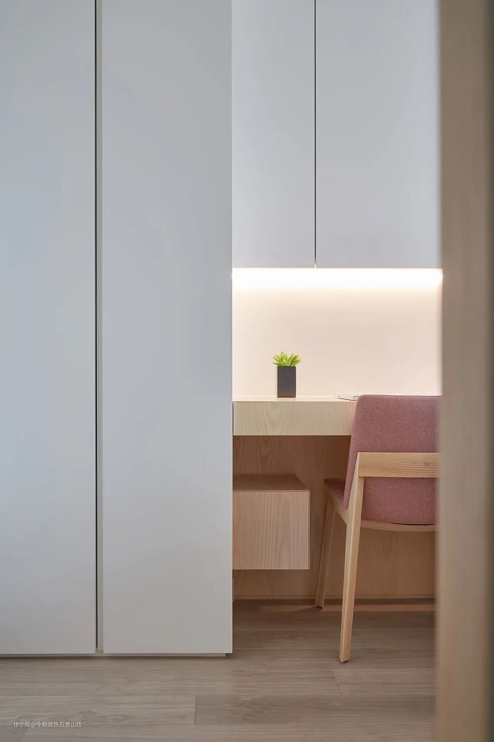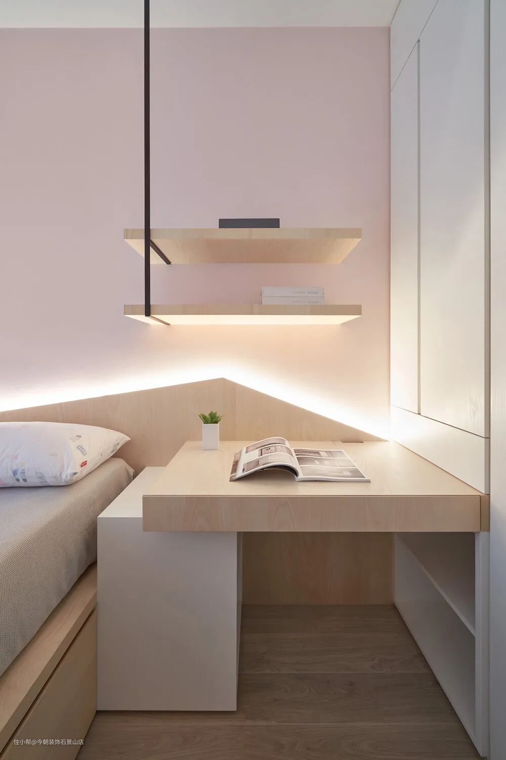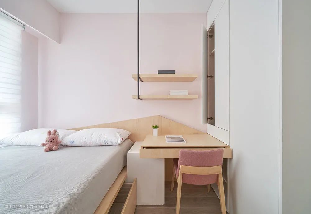 小孩房粉色系,因为空间小所以也是以卧榻整合床架。