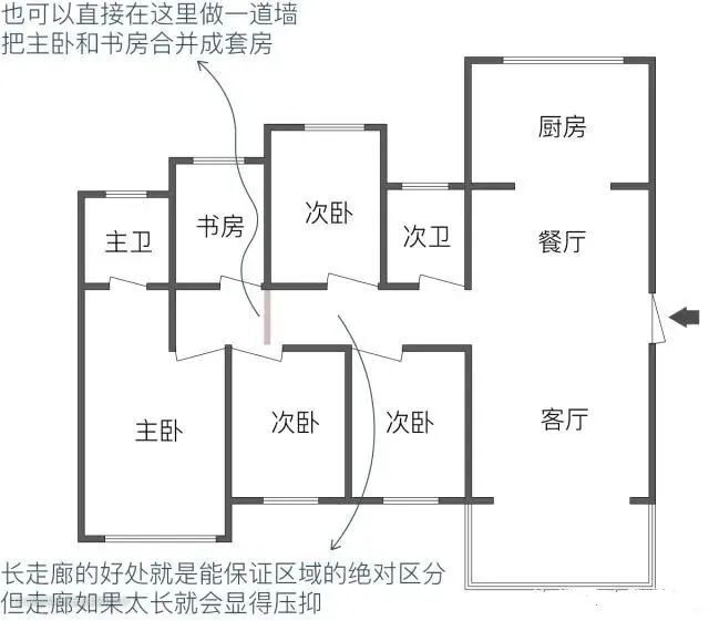 某些类型的公寓会将主卧室套房安排在入口附近,以便房主在回家后可以直接进入主卧室套房,而不会影响其他人。