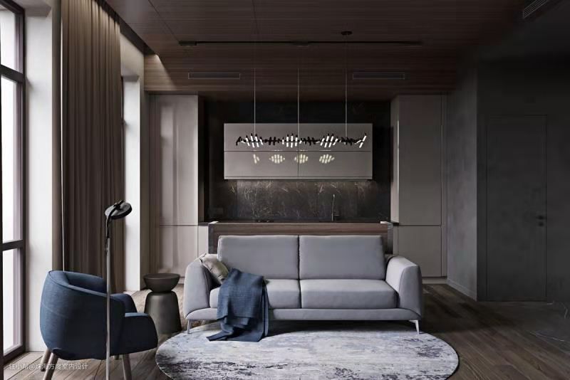 客厅,大面积灰色的使用和深蓝色单品的搭配奠定了冷色调的装修风格。低饱和度的木质地板、天花板,在和谐搭配的基础上中和了冷色调中的冰冷,使得整个空间高级而观感舒适。