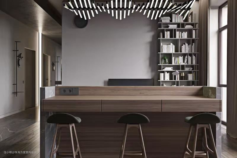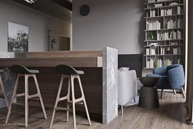 吧台的凳子正对着客厅,独特的抽屉和电源的设计使得这里既可以当作餐桌也可以是工作休闲区域。木质的台面搭配双侧大理石别具设计感,此外,木质台面的突出设计既构建了整体吧台的微妙平衡,又为使用者打造了舒适的使用距离。