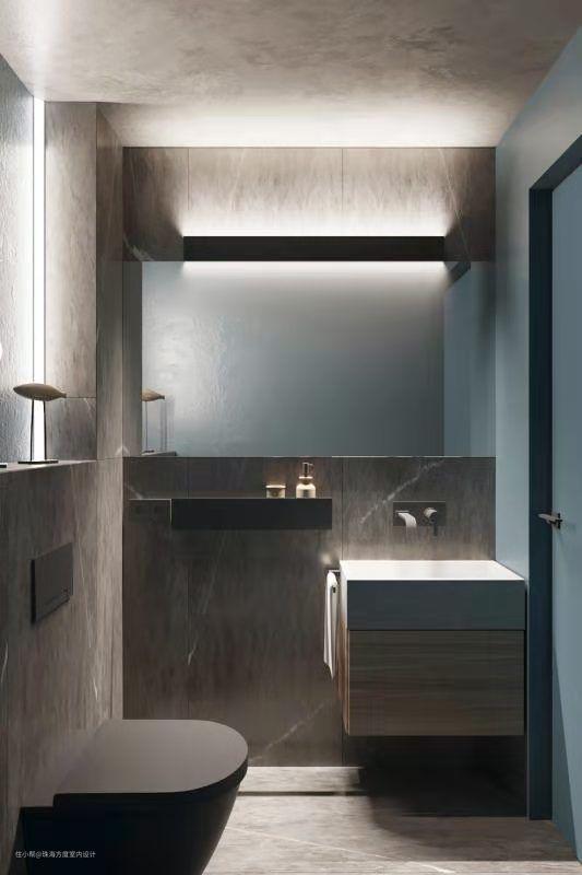 极简主义的盥洗架和水槽透露出:简约仍是卫生间设计的主基调。深灰色的壁挂式马桶更加彰显现代风格。