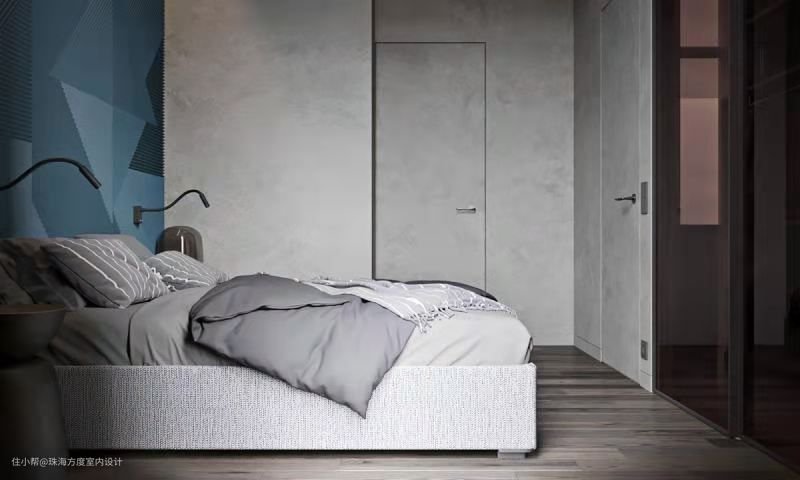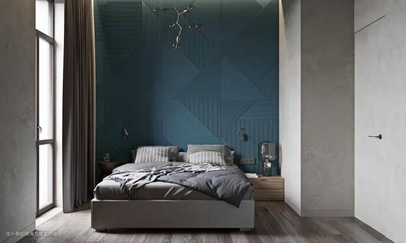 进入卧室,熟悉的灰、蓝色占据了整个墙面空间。独特的蓝色纹理墙面由肋板分割成几何图案增加了设计质感,是整个卧室的亮点。