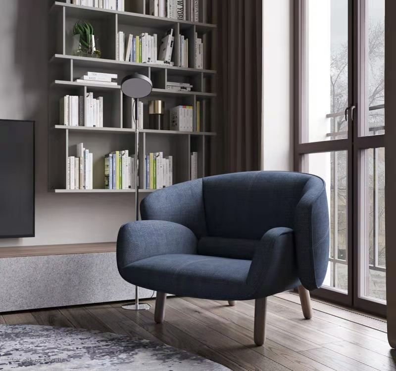 深蓝色的沙发椅在整个客厅空间起了画龙点睛的作用。壁挂式书架占据了半面电视墙,形成了“读书角”的设计,试想在夜晚取一本书窝在沙发椅上,伴随着落地灯的灯光,很是惬意……