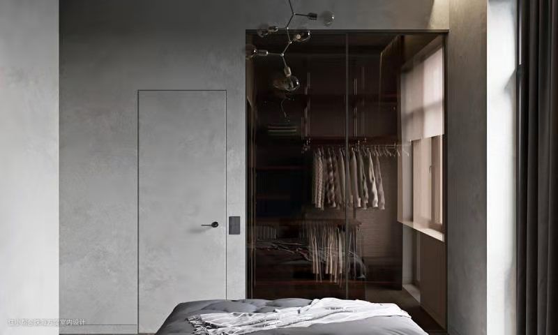 隐形门的一侧利用茶色玻璃壁橱分割成了衣帽间,透明的玻璃映衬着整齐的衣架,别具现代感。
