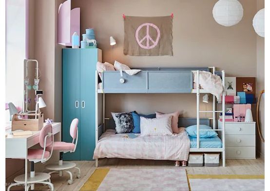 两个宝宝可以放两张小床,也可以放一个高低床。