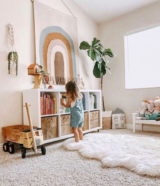 一排小矮柜,藏露结合,养成自主收纳的习惯,把书籍摆在明面上,随时都可以看。