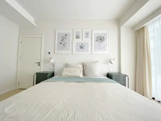 衣柜和床并列,柜体中间嵌入一个台面,充当床头开放收纳台,省掉一个床头柜,下床开合衣柜也更宽敞了。