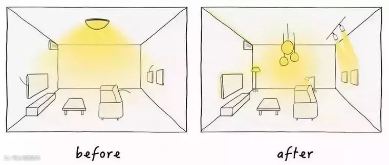 一般人都会想,房间只要够亮就行了,于是就出现了下面这种“一盏荧光灯or吸顶灯走天下”的死板场景 ↓