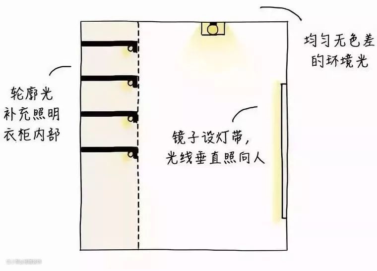 衣柜的局部照明,是为了方便使用者在打开衣柜时,能够看清衣柜内部的情况。衣帽间需要均匀、无色差的环境灯,镜子两侧设置灯带,衣柜和层架应有补充照明。最好选用发热较少的LED产品▼