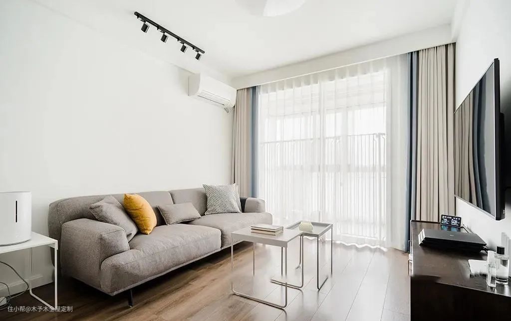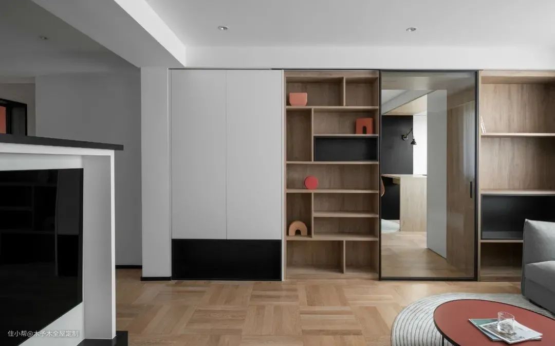 每个方块看起来是由多块地板拼成,实际上是一个整体,就像一块地砖,方方正正的效果显得户型也很规整。