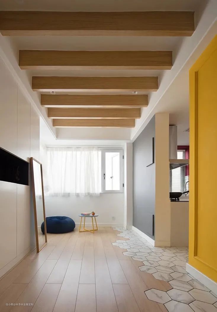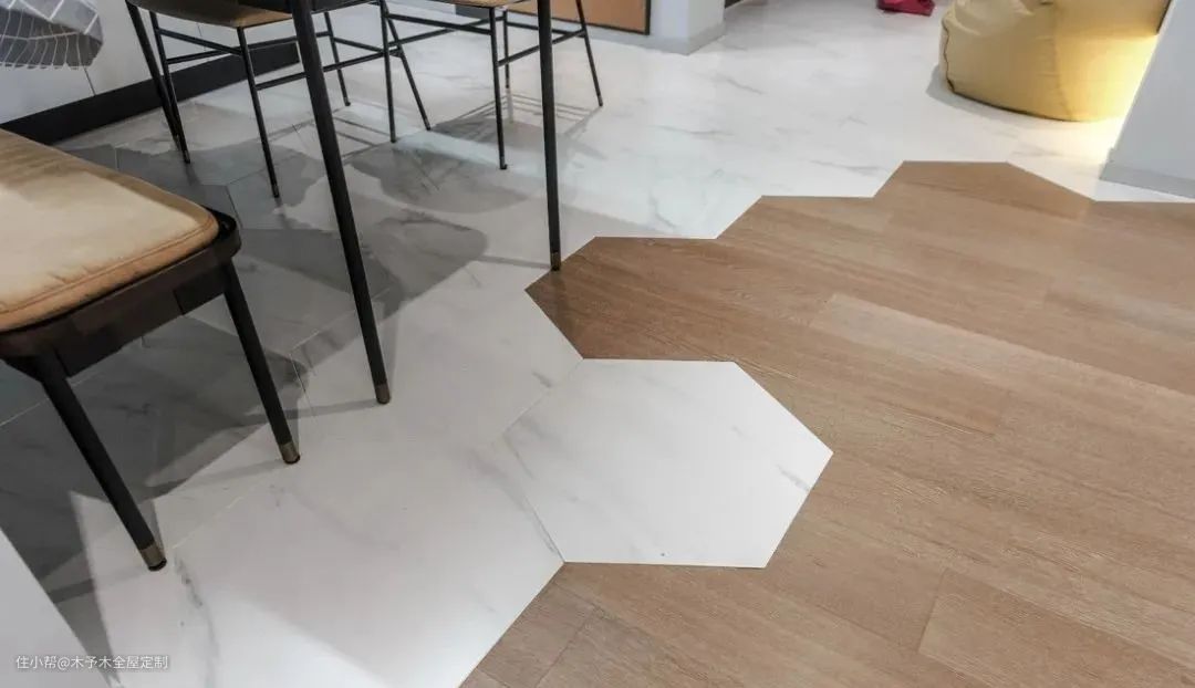 将地板和瓷砖拼接的铺法,看似完全不协调的组合,却能混搭出独特的美感。