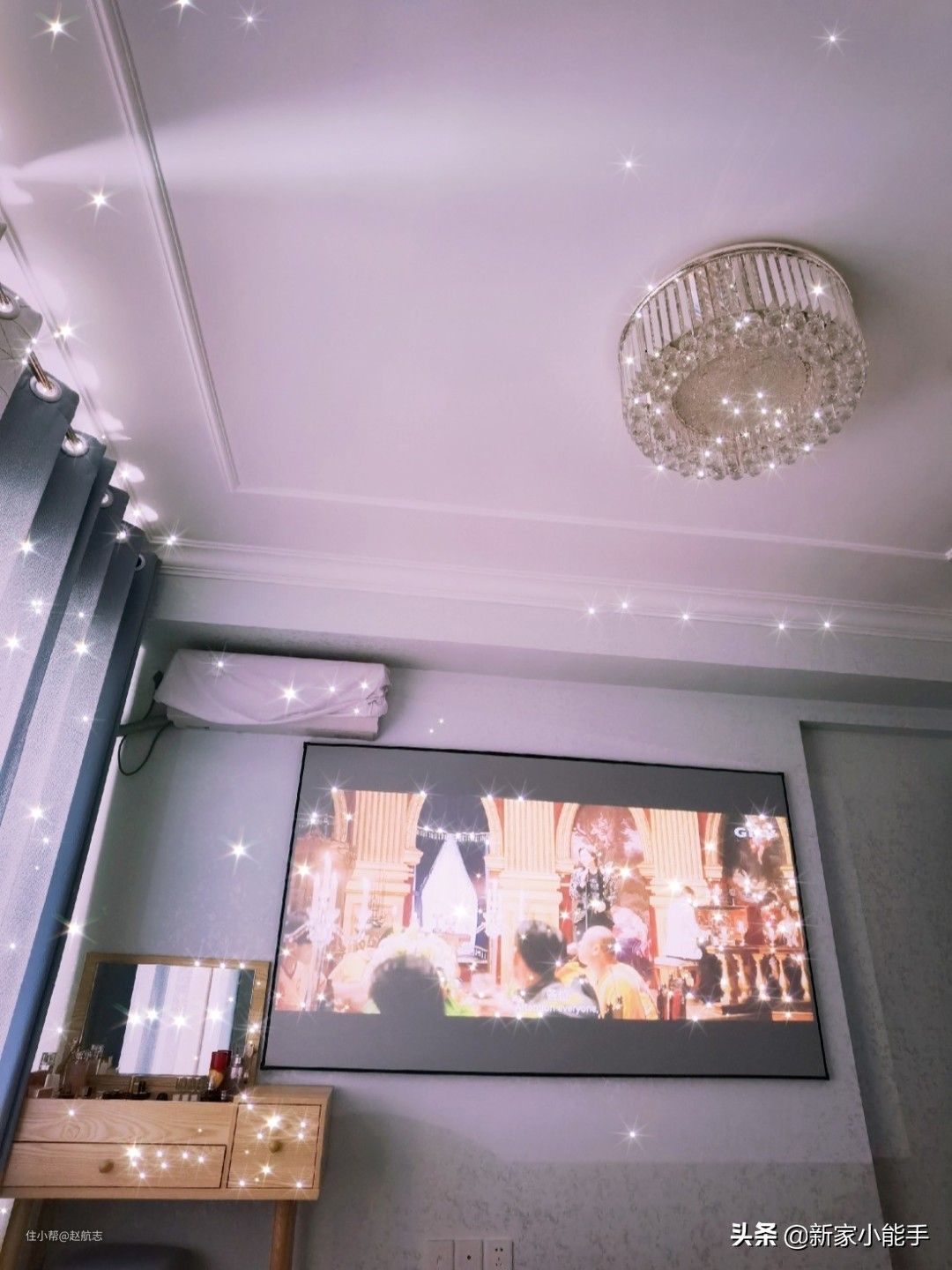墙上安装了一块尺寸很大的投影屏,躺在床上可以直接看电影或者其他,有点类似私人影院的感觉。左侧放着梳妆台,方便女屋主使用。