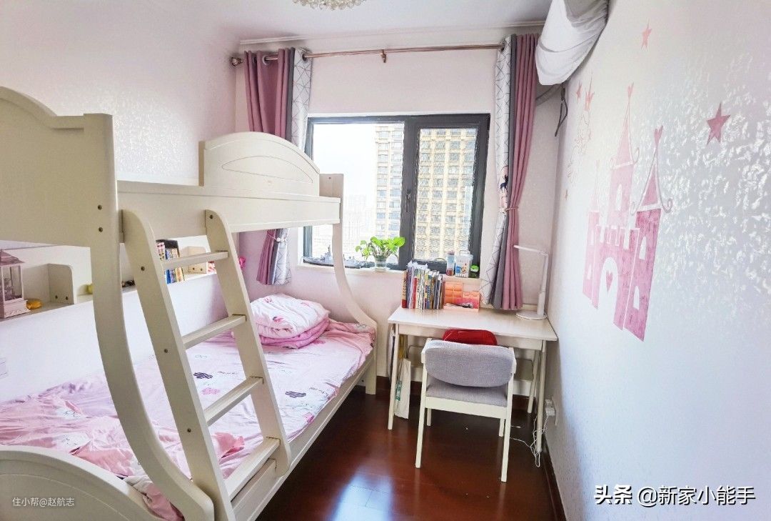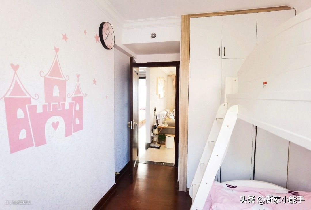 小孩房考虑到实用性,屋主她布置了上下床,更刚把空间利用起来,也方便家里小孩休息,觉得还不错哈。定制的衣柜直接到顶,没有浪费一点空间。墙面贴了墙布,很好看,漂亮又温馨。