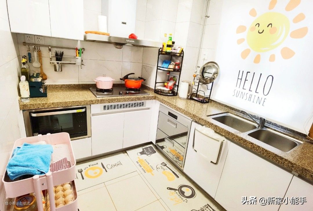 厨房定制了“L”字型橱柜,布局形成了“洗、切、炒”的顺序,水槽布局在靠窗位置,通风更好,并且安装了洗碗机和烤箱,方便做美食。左侧放着一个架子,可以适当增加一些储物空间,特别实用,很有烟火气的厨房,在这里做饭炒菜真的是一种享受啊。