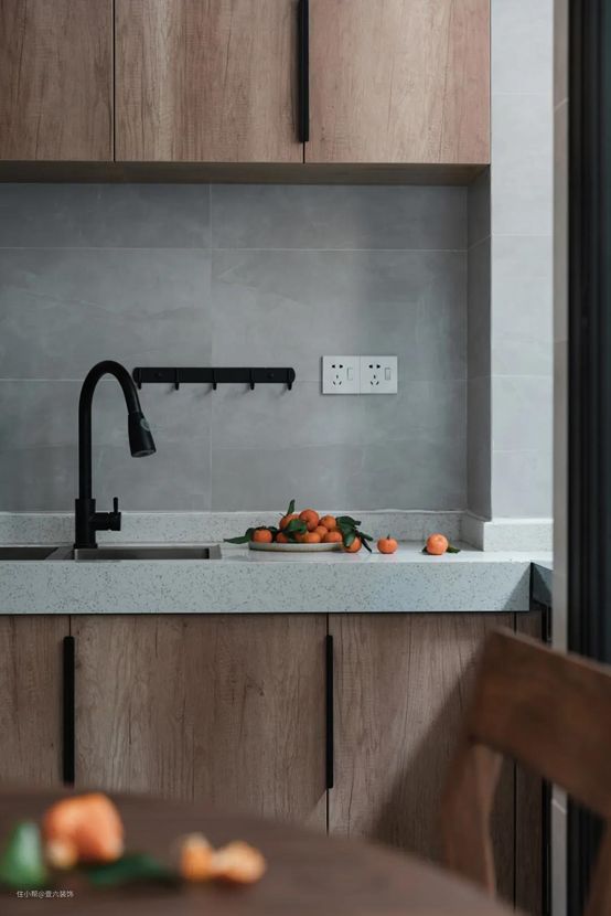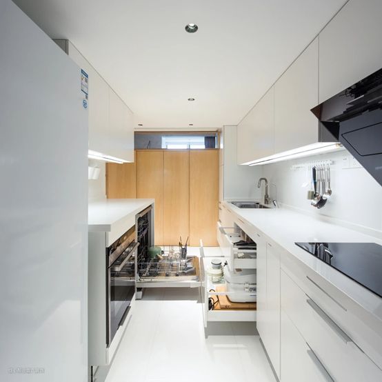 再看一个,一字型厨房同样适用。这里屋主将备菜区和盛菜区融为了一体,再配合餐边柜,动线也很合理。