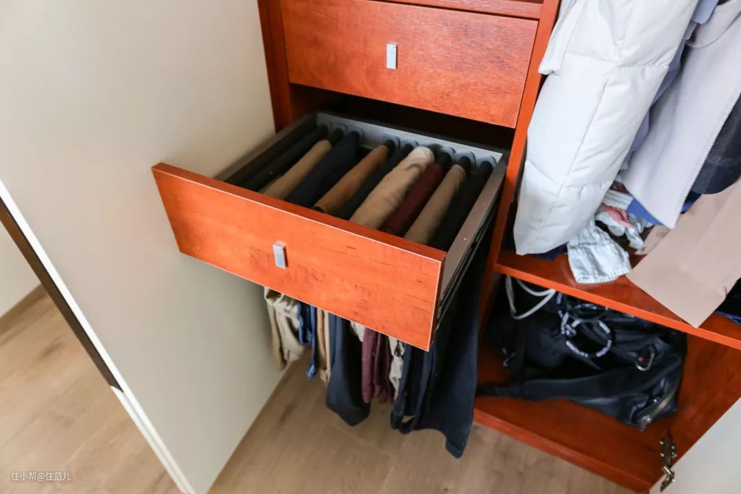 下装区从外面看是抽屉,拉开是挂架,虽然不省空间,但是拿取更方便。