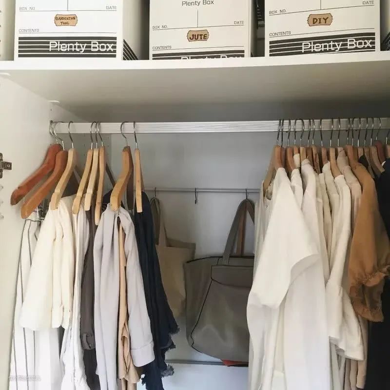 如果你的短款衣服比较多,而现有衣柜全是长衣区,那就直接装上一条伸缩杆,打造上下双层挂衣区就可以。