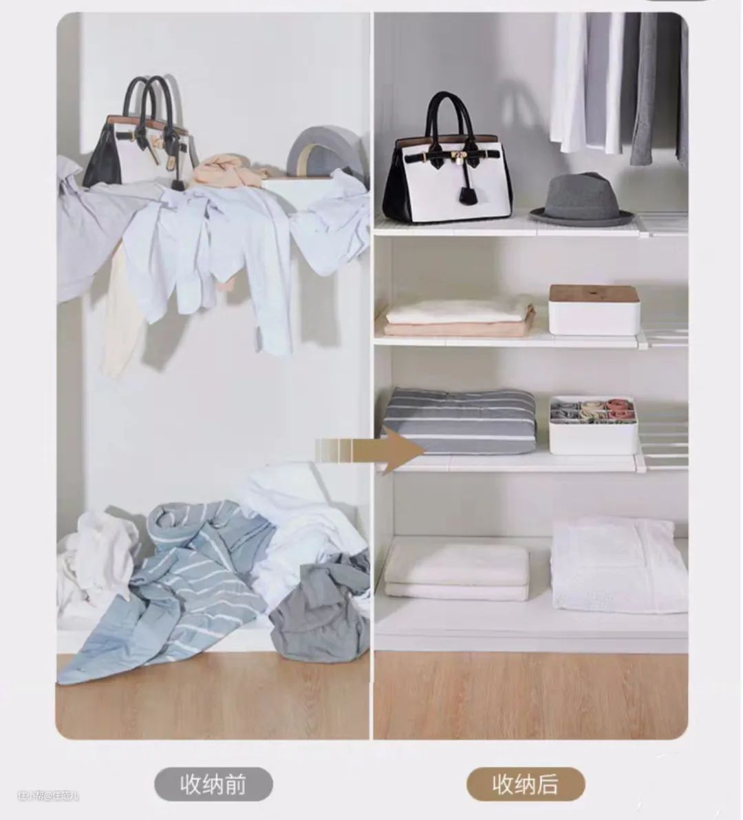 如果你需要收纳包包和帽子,这类怕压的,可以做层板,量一量你的包包,确定层板高度刚刚好就行,不然上面留白浪费,纵向收纳真的很宝贵。