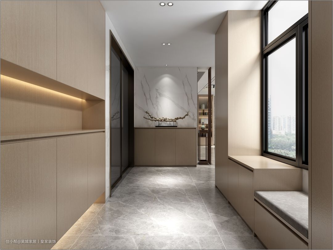 玄关装修效果图3.独立型,如果您家有独立空间的玄关,或者是入户花园,可以设计成独立的储物间,或者用来当做衣帽区、放置临时快递物品等,完美解决家里的收纳难题。