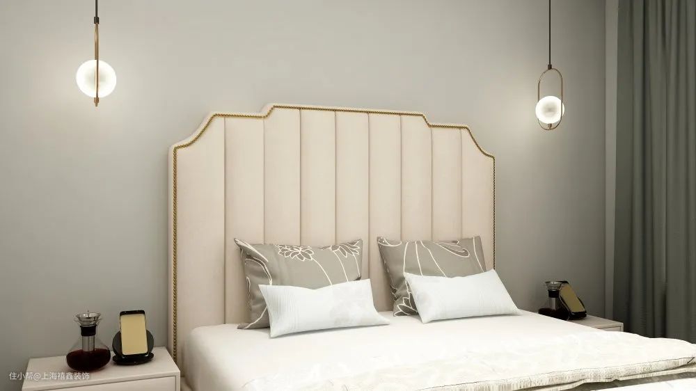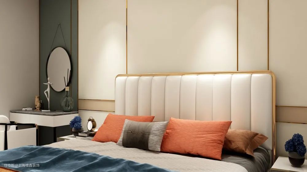 ▲ 主卧,床头以硬包拼接彩漆的设计,使卧室的布局和空间感都得到平衡。偏柔和的色彩加以金属条点缀,让空间气质感更为突出。