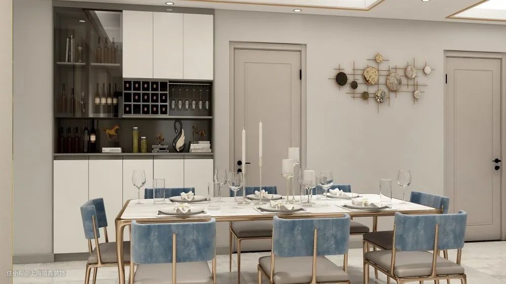 ▲ 餐厅以餐桌椅纤细优雅的线条,中和了空间的庄重感,添加了些许温软清逸的生活气息。靠墙的餐边柜满足屋主收纳需求,中间酒柜穿插布置,打造出精致高端的空间格调。