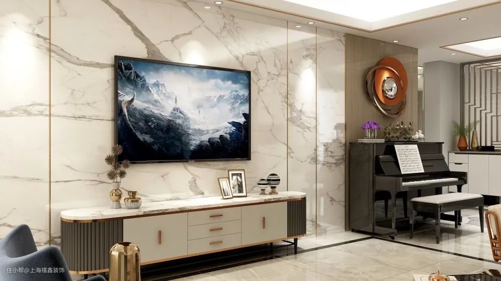 ▲ 电视背景墙以大理石造型呈现,辅以精致的金属线条,细节完美,提高了整体空间的层次氛围。地面大理石的自然纹理,流畅而富有艺术感。