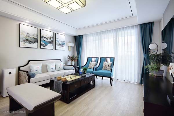 ▲孔雀蓝窗帘与同色家具相呼应,呈现整体个性新中式。