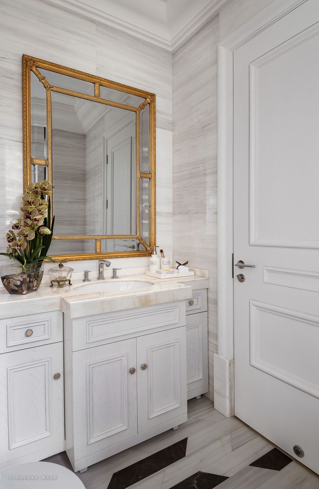 卫生间则是采用了干爽的瓷砖搭配,嵌入一面金色镜子,华丽又不缺实用性。