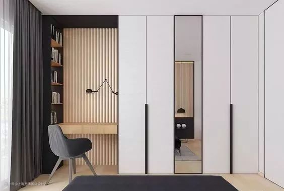 带有衣帽柜、储物柜等具有储藏功能的空间,是最适合做隐形门的地方。尤其注意的是门要和柜子齐平,这样可以更好的达到“隐身”的效果。