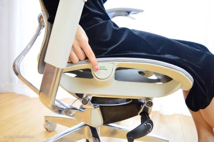 ▼按住扶手下方的按钮就可以实现上下6cm的调节,这个调节主要是为了适应不同高度桌面。毕竟长时间办公时,如果手臂长时间处于下坠状态得不到有效的支撑,就会产生酸麻的现象,长此以往一定是不利于健康的。