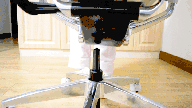 ▼上半部分的组装就更为简单了直接将坐垫底部的孔洞对准气压棒安上去即可。虽然简化了椅背和扶手的操作步骤,但整个椅子的分量由于十分沉重,对于女生来说还是有些费劲。
