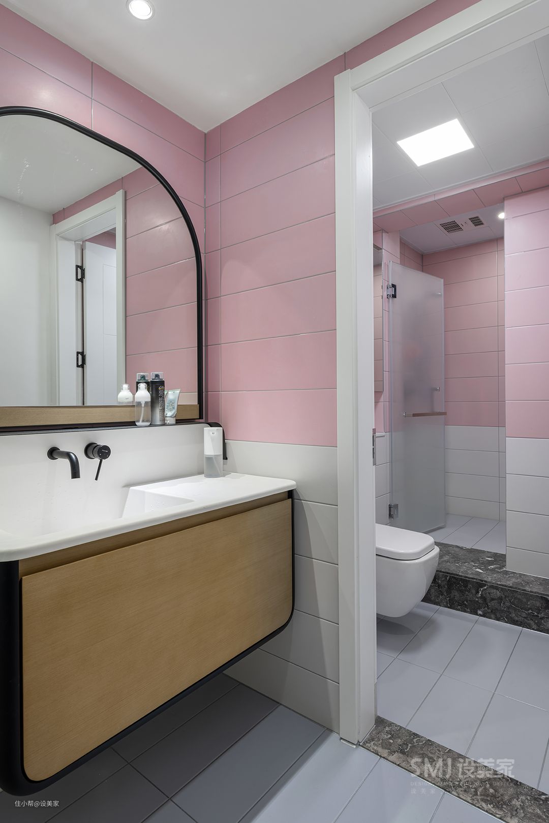 原本公卫只有3㎡,设计师把原本的小阳台并入室内做了卫生间的淋浴房,于是有了足够的空间把洗漱池外移,做干湿分离。